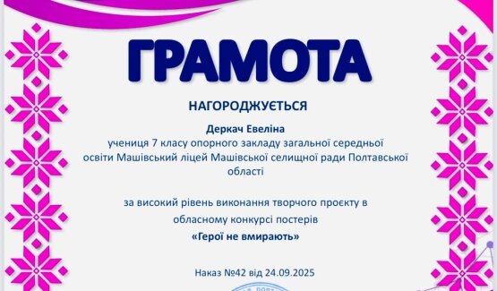 Вітаємо Деркач Евеліну за високий рівень виконання творчого проєкту в обласному конкурсі...