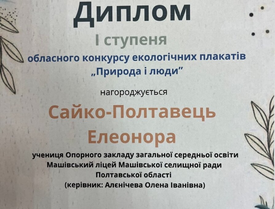 ВІТАЄМО Сайко-Полтавець Елеонору, яка посіла І місце в обласному конкурсі екологічних плакатів "Природа і люди" (керівник Алєнічева О.І.). МОЛОДЕЦЬ!